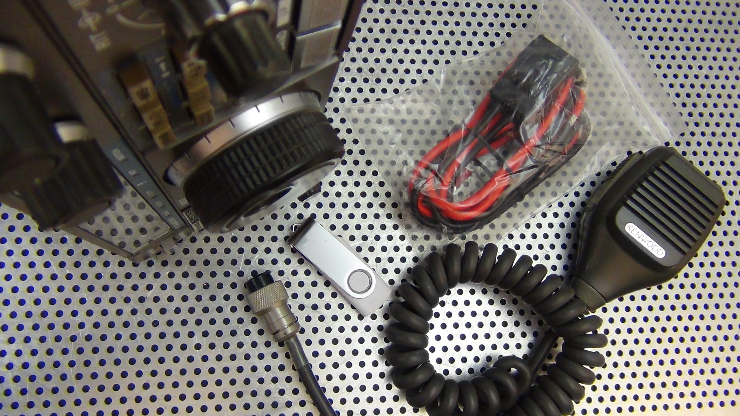 This TS-430 comes with a fused power cable and a Kenwood hand mic as well as manuals on USB drive.
